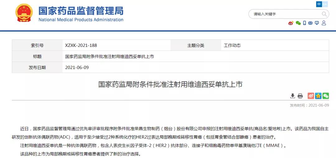2021年6月9日,中國國家藥監(jiān)局(NMPA)最新信息發(fā)布,我國抗體偶聯(lián)藥物(ADC)新藥——注射用維迪西妥單抗(商品名:愛地希®)獲得上市批準。該藥品為我國自主研發(fā)的創(chuàng)新抗體偶聯(lián)藥物(ADC),適用于至少接受過2種系統(tǒng)化療的HER2過表達局部晚期或轉(zhuǎn)移性胃癌(包括胃食管結(jié)合部腺癌)患者的治療。