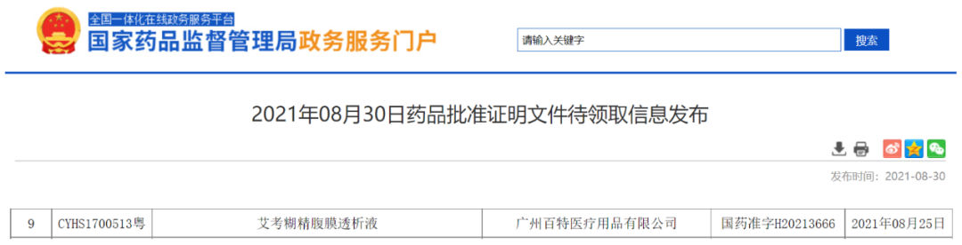 2021年8月30日,根據(jù)國家藥品監(jiān)督管理局(NMPA)官網(wǎng)公示,廣州百特醫(yī)療用品有限公司申報的艾考糊精腹膜透析液獲批[1],批準(zhǔn)文號:國藥準(zhǔn)字H20213666。該藥品用于終末期腎病(ESRD)患者的持續(xù)性不臥床腹膜透析(CAPD)每日單次長時間留腹(8小時至16小時)治療,用于改善高平均轉(zhuǎn)運或高轉(zhuǎn)運(通過腹膜平衡試驗PET診斷)患者的長時間留腹超濾作用以及肌酐和尿素氮清除率[2]。廣州百特醫(yī)療用品有限公司持證的艾考糊精腹膜透析液中文注冊商標(biāo)為愛透佳。