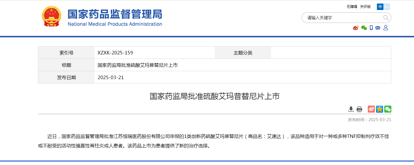 近日,國家藥品監(jiān)督管理局批準江蘇恒瑞醫(yī)藥股份有限公司申報的1類創(chuàng)新藥硫酸艾瑪昔替尼片(商品名:艾速達),該品種適用于對一種或多種TNF抑制劑療效不佳或不耐受的活動性強直性脊柱炎成人患者。該藥品上市為患者提供了新的治療選擇。